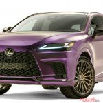 RX500h F SPORT Performanceは、2022年内に発売予定の「RX500h F SPORT Performance」をベースに、マットバイオレットメタリックのラッピングを施し、22インチのRAYSの「ホムラ 2×15 BD」(22×9.5)に、ミシュランパイロット スポーツ 4S」(265/40ZR22)を組み合わせたモデル。しかし、ゴールドのホイールにマットバイオレットとは、マットブラック以上にド派手だ……。