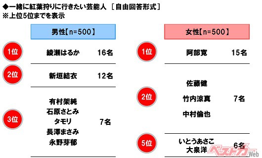 一緒に紅葉狩りに行きたい芸能人 男性回答1位「綾瀬はるかさん」、女性回答1位「阿部寛さん」