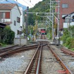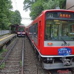 箱根湯本を出ると電車はぐんぐん急坂を上っていく。駅を出て少し進むとただちに80パーミルの急こう配に差し掛かる。全長15mの電車では先頭部と後部の高低差は計算上約1.2mにもなり、乗っていても電車が斜めに傾いているのがわかるほど。「かまぼこの里」に保存されているような旧型電車の時代はモーターをグワングワン鳴らしながら勾配を上っていたが、最新型では騒音はあまり気にならない。いっぽうで急カーブを曲がるときは水を撒いていても車輪がキーキーと音を立て、いかにも苦しそうだ。