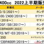 251~400ccクラスの販売2位はNinja400(カワサキ)で、907台増の2164台。前年に年間首位だったSR400(ヤマハ)は既に生産が終了しており、1457台(1471台減)と大幅に減少している。同じくロングセラーで、2022年10月末に生産終了となったCB400SF/SBはクラス4位。前年から133台増の1319台だった。