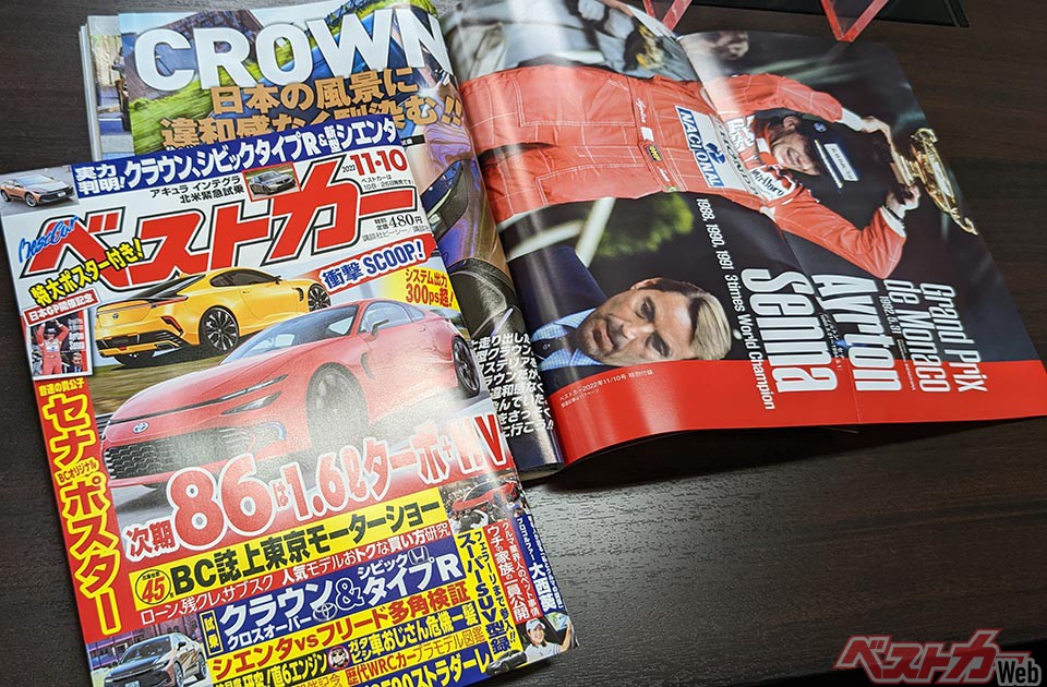 2022年10月11日、全国書店・コンビニで発売される『ベストカー』2022年11/10号は、いまなお伝説のドライバーとして語り継がれる天才F1パイロット、アイルトン・セナの特別ポスターが付く。新型クラウン、新型シビックタイプRの試乗記のほかにも、巻頭スクープで「次期型GR86開発情報キャッチ」という衝撃的な最新情報もお届けしております。