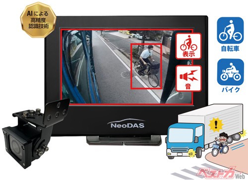 今回発売の本製品はトラックやトレーラーなどの大型車両の左サイドミラー付近に取付けるカメラからの映像をディープラーニング基盤のAIアルゴリズムで分析し、自転車や二輪車などの接近を的確に検知、警報することで安全運転をアシストするソリューションです。