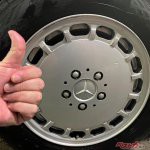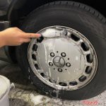 テスト車に選んだのはW124型ベンツEクラス。ブレーキパッドは純正品を装着しているため、ブレーキダストがホイールについてしまうのはお約束。オーナー氏によれば、「普段は洗車用シャンプーとブラシで洗っていますがなかなか落ちないんですよ。暑い夏には4輪洗うだけで汗びっしょりになったこともあります」。