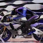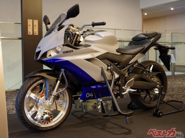 会場に展示された車両は、ガソリンエンジンのYZF-R3をベースに電動(EV)化した研究段階のモデル。エンジンにもAMSASは搭載できるが、より制御のタイムラグが少ないEVの方が自立には向いているという。