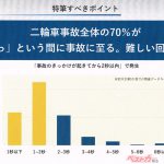 さらに二輪車事故の70%は「事故のきっかけが生まれてから2秒以内」に発生しているとのデータも。しかしバイクはとっさの回避操作が困難という問題がある。