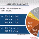 また、同社の調べでは、二輪車が関連する事故原因として、四輪ドライバーの認知ミスが41%、判断ミスが14%を占め、二輪ライダーのミスは32%という。