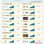 大人気のハリアーはおしなべて高得点だが、衝突安全の後面衝突時の頸部保護(運転席/助手席)、歩行者保護(頭部)、シートベルト着用警報で満点をとれなかった。衝突被害軽減ブレーキは夜間の歩行者に対しても満点だった。