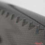 それすらも上下方向の入力大きいため激しく揺さぶられる。100km/hのダウンフォース、頑張っても二桁kgに届かない。フラットなサーキットなら敏感な人で気付くくらいだと思う。この時点で「さすがの実効空力を目指すモデューロも解りにくいでしょうね」と考えつつピットに戻り、ウイング交換。写真を御覧頂ければ解る通り、モデューロのフルカーボン製ウイング、カッコ良い!