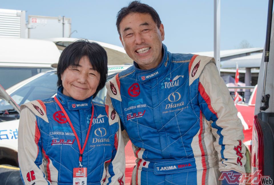 古い『ベストカー』の読者にはお馴染み、かつての連載執筆陣であり、夫婦そろってラリードライバーの小出久美子選手(通称「コクミ」)と秋間忠之選手(通称「くまちゃん」)。全日本ダートトライアル選手権ではボディに大きく「ベストカー」とペイントされたランエボで参戦しており(創刊編集長より許可済み)、知る人ぞ知る名物夫婦であります。