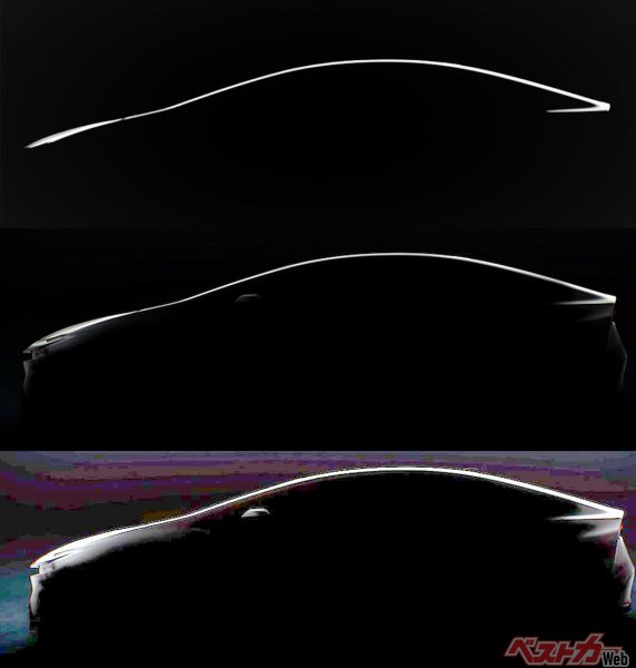 これまでの新型プリウスのティザー画像を振り返ると、Aピラーがかなり寝たクーペルックの低いルーフが特徴的だ。リアゲートには「PRIUS」の大きな文字エンブレムがあり、新型クラウンのような高級感が溢れている。