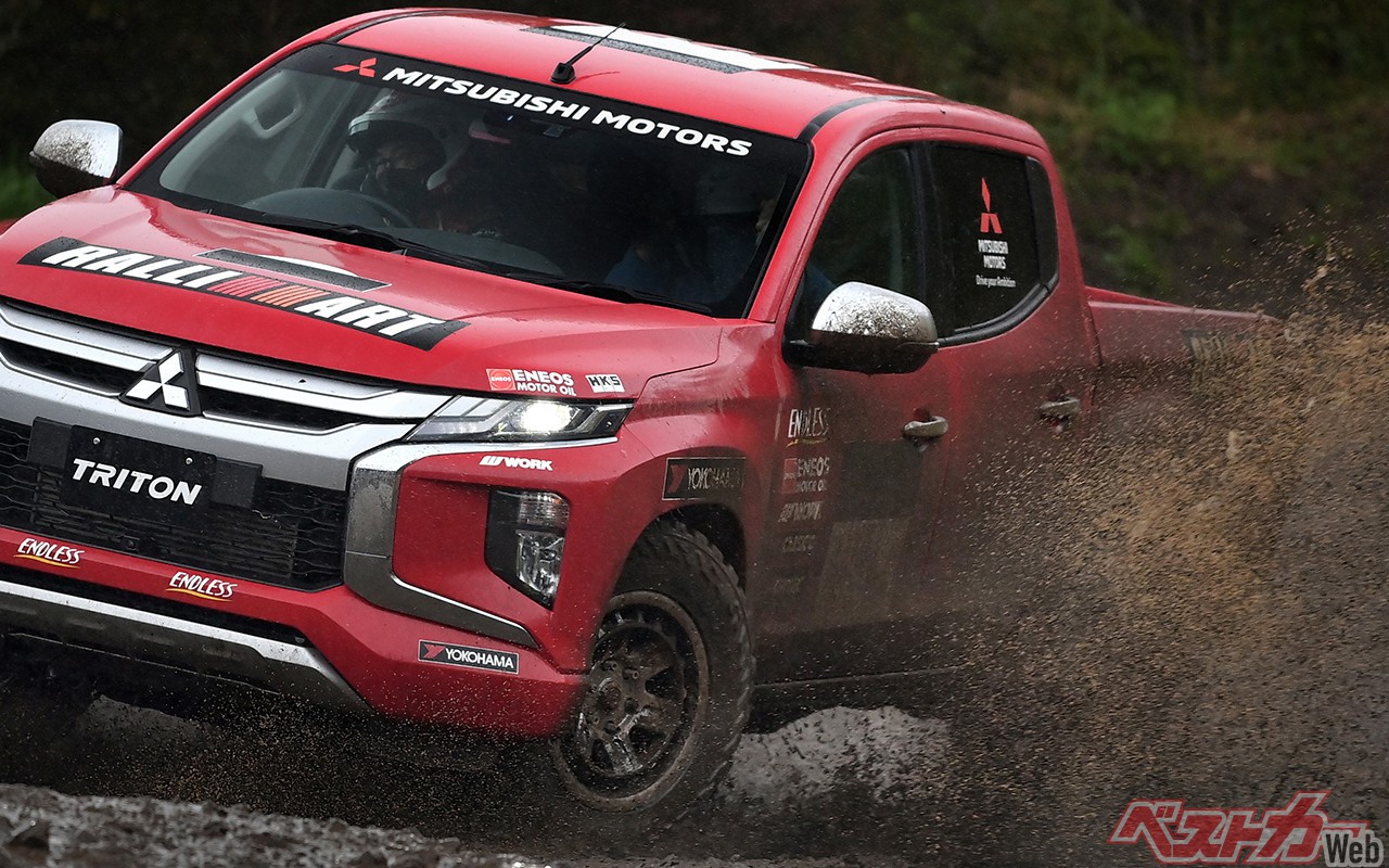 マシンは東南アジアをはじめ各国で売れに売れているピックアップトラックのトライトンだ。今回ラリーマシンに同乗試乗したのだが、この実力が待ってました三菱!! というほど凄まじいモノであった。