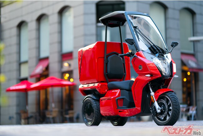 大型スクリーンとルーフ、独立懸架リアサスペンションによる3輪構造、前後13インチ大径ホイールという独自の車体構成により、従来のビジネスバイクが持つさまざまな課題を解決する、原付一種(50ccクラス)の電動3輪バイク。