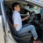 そこで、クルマのドアを開けて、まず、スキーを滑る時のような腰を突き出す状態で、そのままお尻から座席に座ります。クルマの正面とは垂直に乗る形となります。