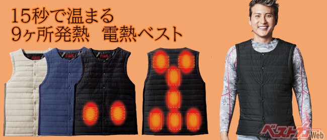 今回、発売されたこちらの電熱ベストは全面2ヶ所と背中7ヶ所の計9カ所が発熱し15秒と短時間で温まるという優れもの
