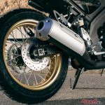 レガシーは、軽量なスポークホイールにゴールド仕様のアルミリムを採用。タイヤは、オフロード系のブロックパターンを採用したメッツラー製カルーストリートを履く。さらにマフラーカバーのデザインが異なり、2ピースのアルミ製としている。
