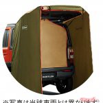 アウトドア派に欠かせないのが、カーテン&タープキットだ。これは跳ね上げた荷室のリアハッチを利用して居住スペースを拡張するアイテムで、雨天の際などにも強い味方になる。タープの下にはコンパクトなテーブルと椅子程度なら置けるから、車内ではできないバーナー調理なども楽しめる。タープ内を外から遮るインナーも付属するから、ちょっとした着替えなどに役立つはずだ。1年間2万kmの保証が付いている点も純正オプションならではだ。