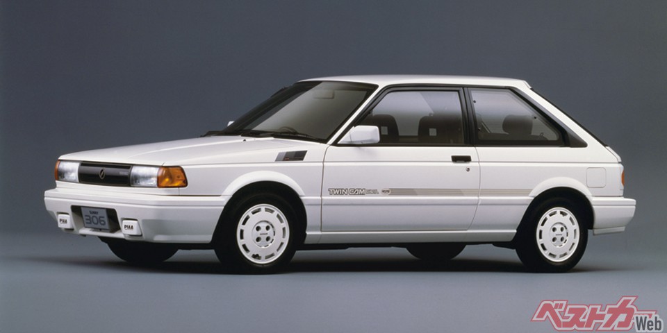 サニー306は6代目サニー3ドアハッチバックの1・6Lツインカム搭載車で、NISMOはエアロパーツやNISMOロゴ入りシート、365mmの小径ステアリングなどを装備。