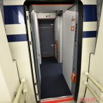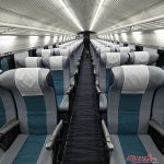 客室部は中央の通路を挟み、2人掛け座席が左右に並ぶ配列。新幹線普通車の2列+3列の座席配置とは異なり在来線特急のような配列だ。先頭車は6列で定員24名、中間車は最大15列で60名の定員となる。座ると前後間隔は広く快適。リクライニングは最新のN700S系のグリーン車のように背もたれに連動して座面も沈み込むタイプでゆったり座れる。