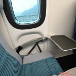 広さ感としてはN700系列の普通車以上だが、グリーン車ほどではない、といった印象。それでも座面幅は477㎜あり、N700Sのグリーン車の座席幅480㎜に近い広さ。ただ、背もたれの重厚感や座面のクッション厚などはグリーン車には及ばない。