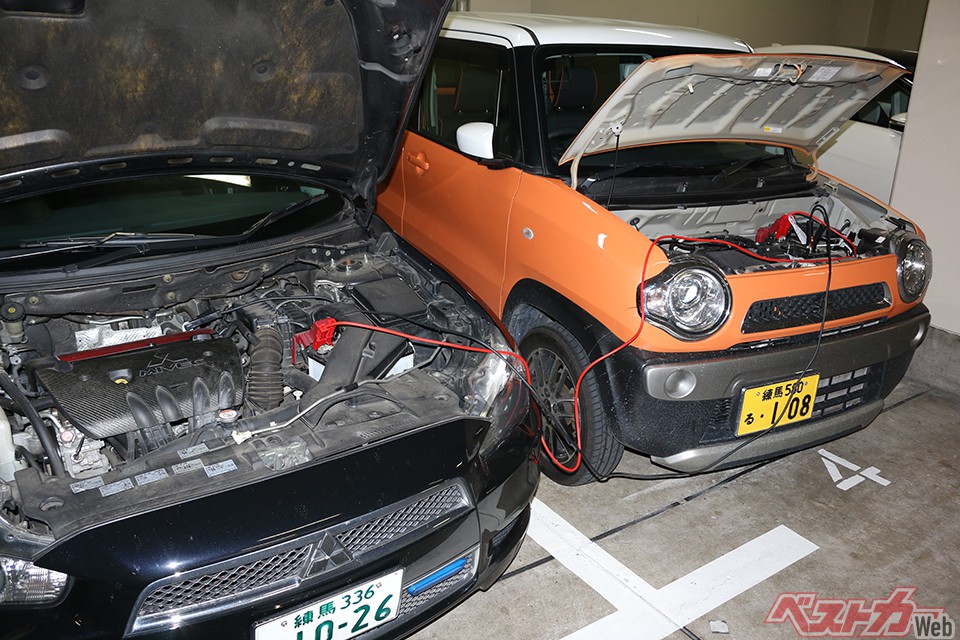 バッテリーが上がってしまったら、救援車とブースターケーブルで接続するか、バッテリー内蔵のジャンプスターターを利用するしかない。