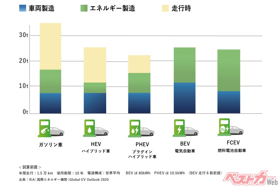 トヨタの試算によれば、BEVはエネルギー、つまり電気を製造するうえで、大量のCO2を排出しており、製造や走行時のCO2の排出を考えると、大きな差がなくなってしまいます。