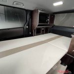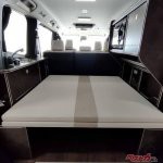 ポップアップルーフ部分のベッドボードには2人就寝できる。ルーフ部分にはソーラーパネルの設置も可能、テント部分はグレー、オレンジ、ブルーのカラーも選べる。