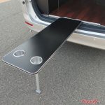 真中のベッドマットを一枚取り外して対面で使うことができるカップフォルダー付きのテーブルは、設置位置をバックドア側に移動して就寝時の小物置として使えるほか、バックゲートを開けてゲートを屋根のような状態にして外に設置することもできる。