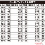 耐荷重性は負荷能力、すなわち「ロードインデックス」という指標で示されており、各タイヤ、サイズごとに示されている。