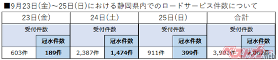 JAF(一般社団法人日本自動車連盟 会長 坂口正芳)は、台風15号の影響で実施したロードサービス救援件数のうち、要請の多かった静岡県の冠水件数をまとめ公開しました。