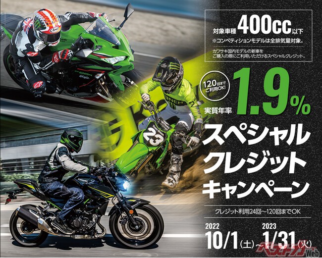 株式会社カワサキモータースジャパン(本社:兵庫県明石市、代表取締役社長:桐野 英子)は、10月1日(土)より400cc以下のカワサキモーターサイクル(コンペティションモデルを含む新車)を、カワサキ正規取扱店で購入時に実質年利1.9%でご利用いただける「カワサキ スペシャルクレジットキャンペーン」を開始いたします。
