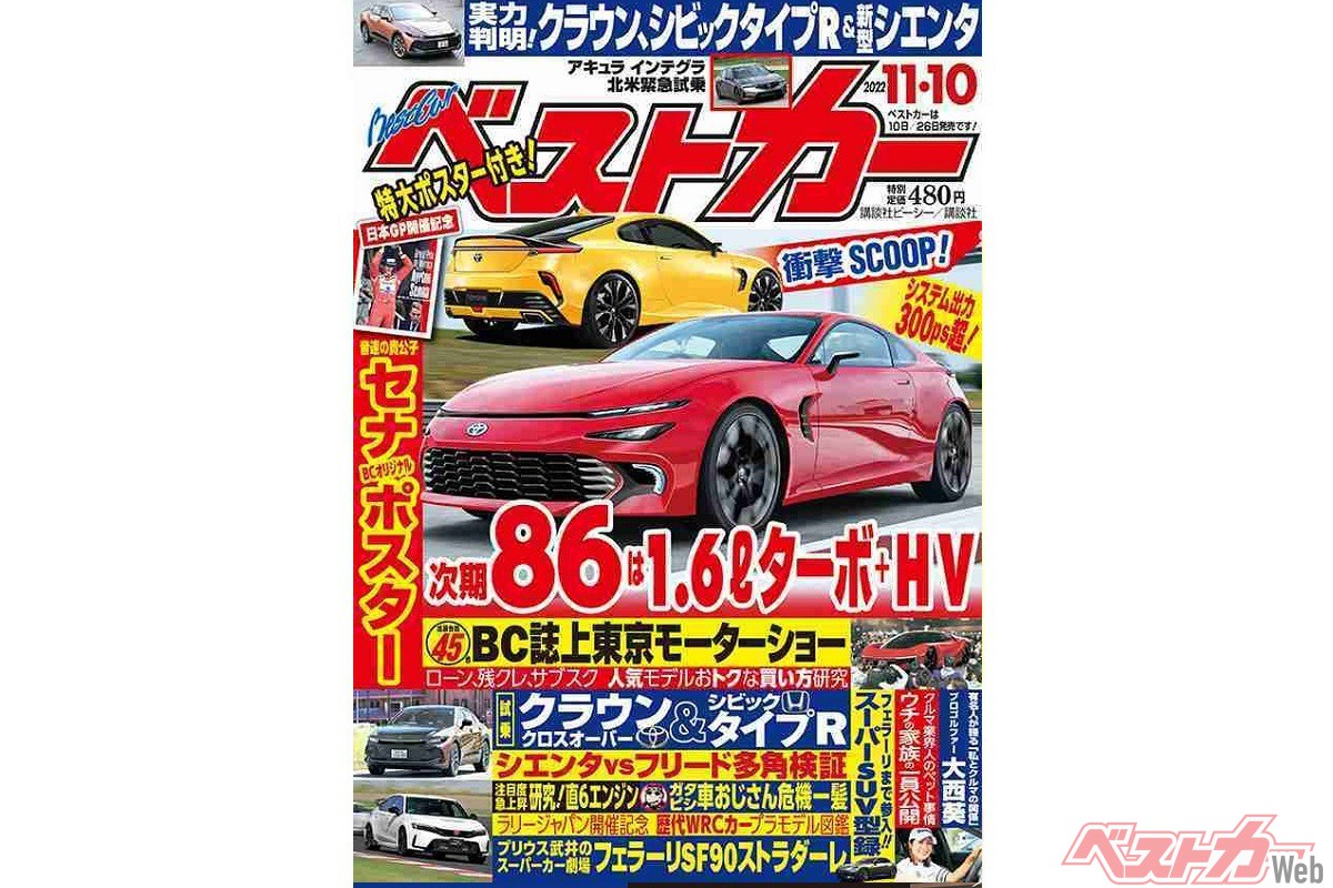 発売中のベストカー11月10日号は「注目新車2台試乗企画」と「あのクルマの次期モデルスクープ企画」が目玉です! 2台試乗は新型クラウンと新型シビックタイプRをレポート。スクープ企画は昨年誕生したばかりの次期型GR86の情報を独自入手! そのほかにも濃い中身の企画がギッシリ!