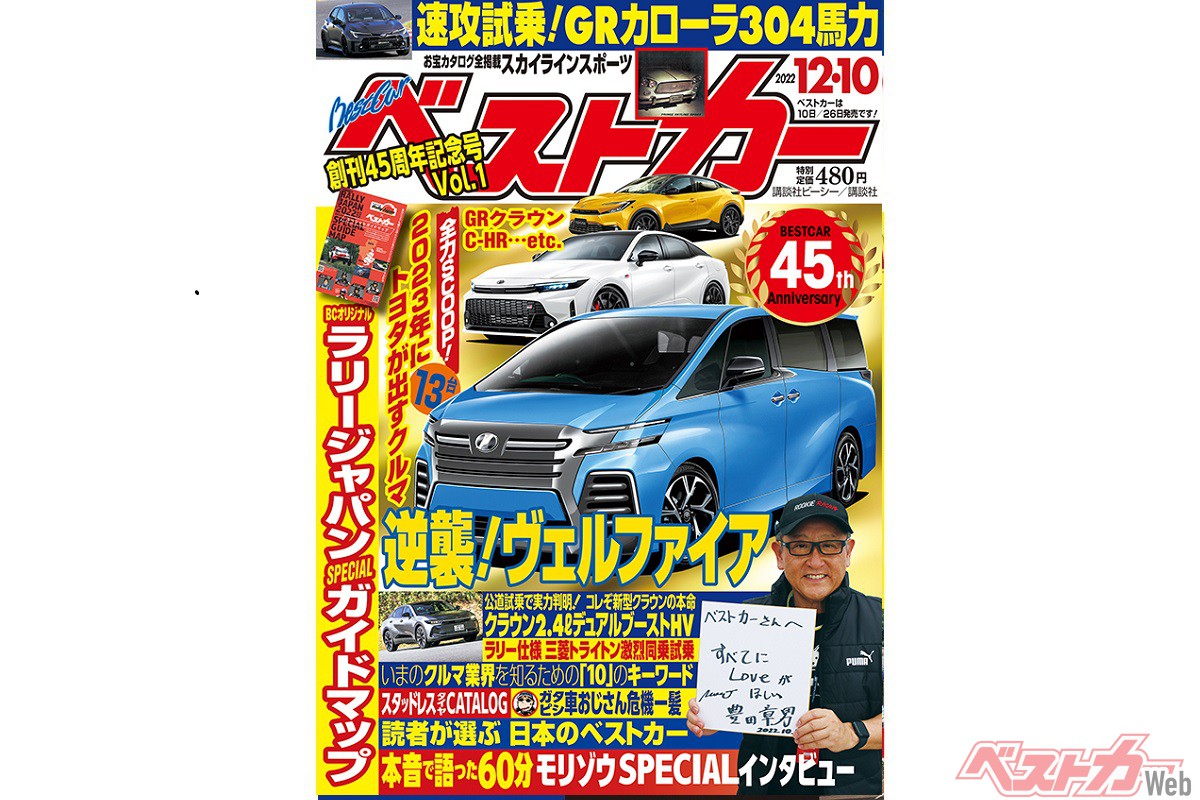 ベストカー12月10日号は「創刊45周年記念号」の第一弾です! 読者のみなさまのご愛読に感謝し、特別な内容でお贈りします。モリゾウ・スペシャルインタビュー、読者が選ぶ日本のベストカー1~50位…など、見どころ満載。次期ヴェルファイアのSCOOP情報もあり!